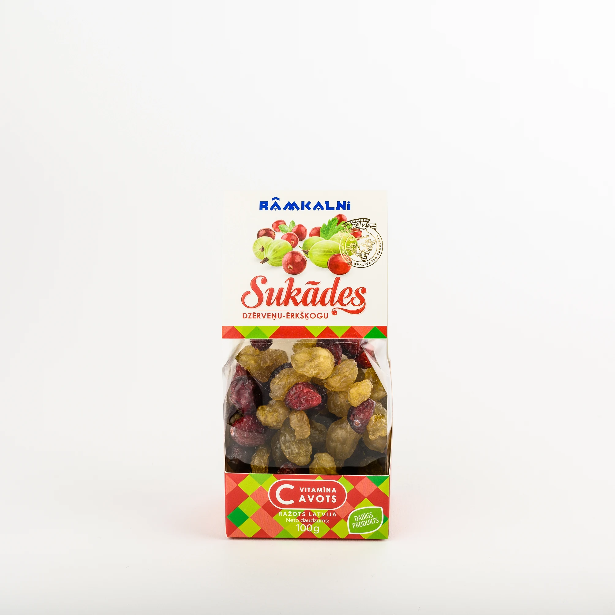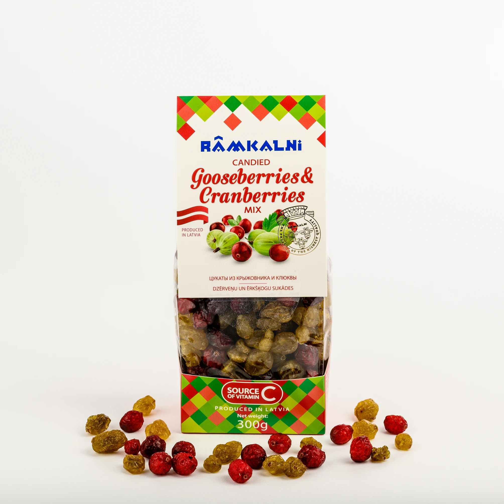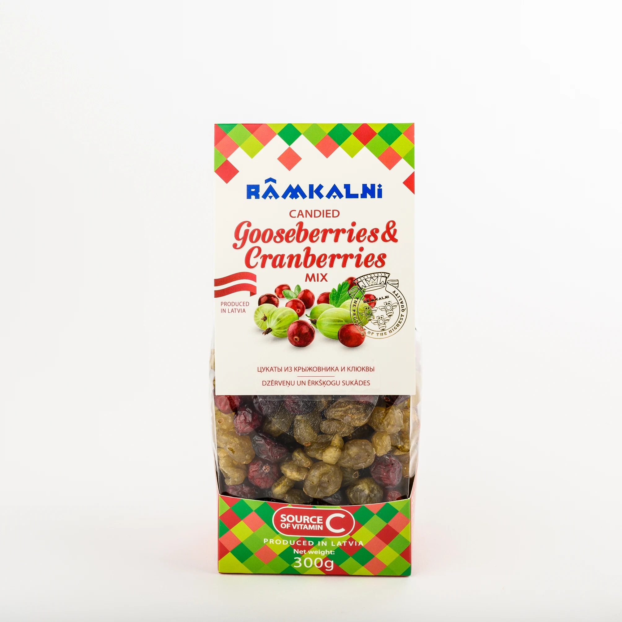 • Ingredients: gooseberry candied fruit 70% (gooseberries 68%, sugar), cranberry candied fruit 30% (cranberries 50%, sugar).