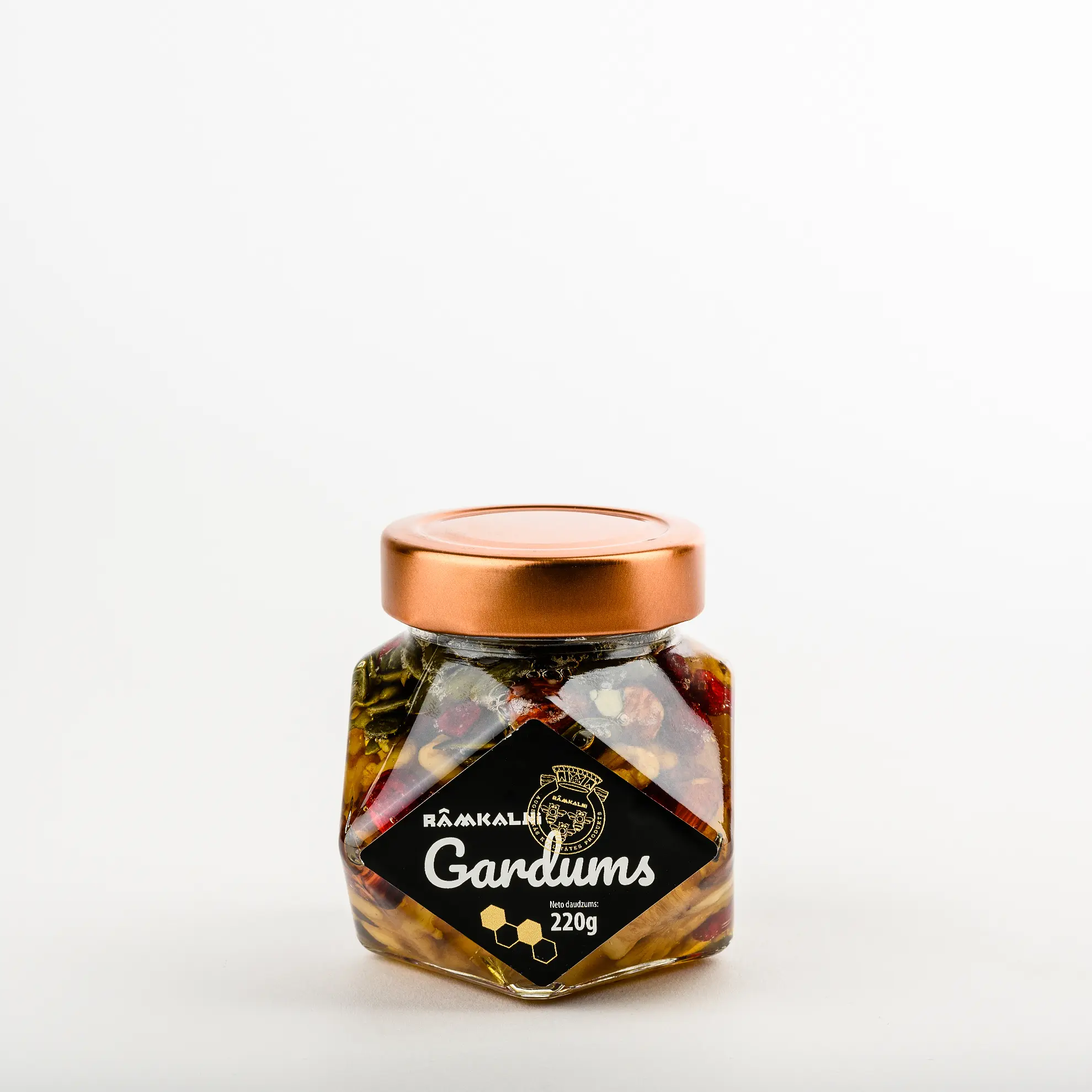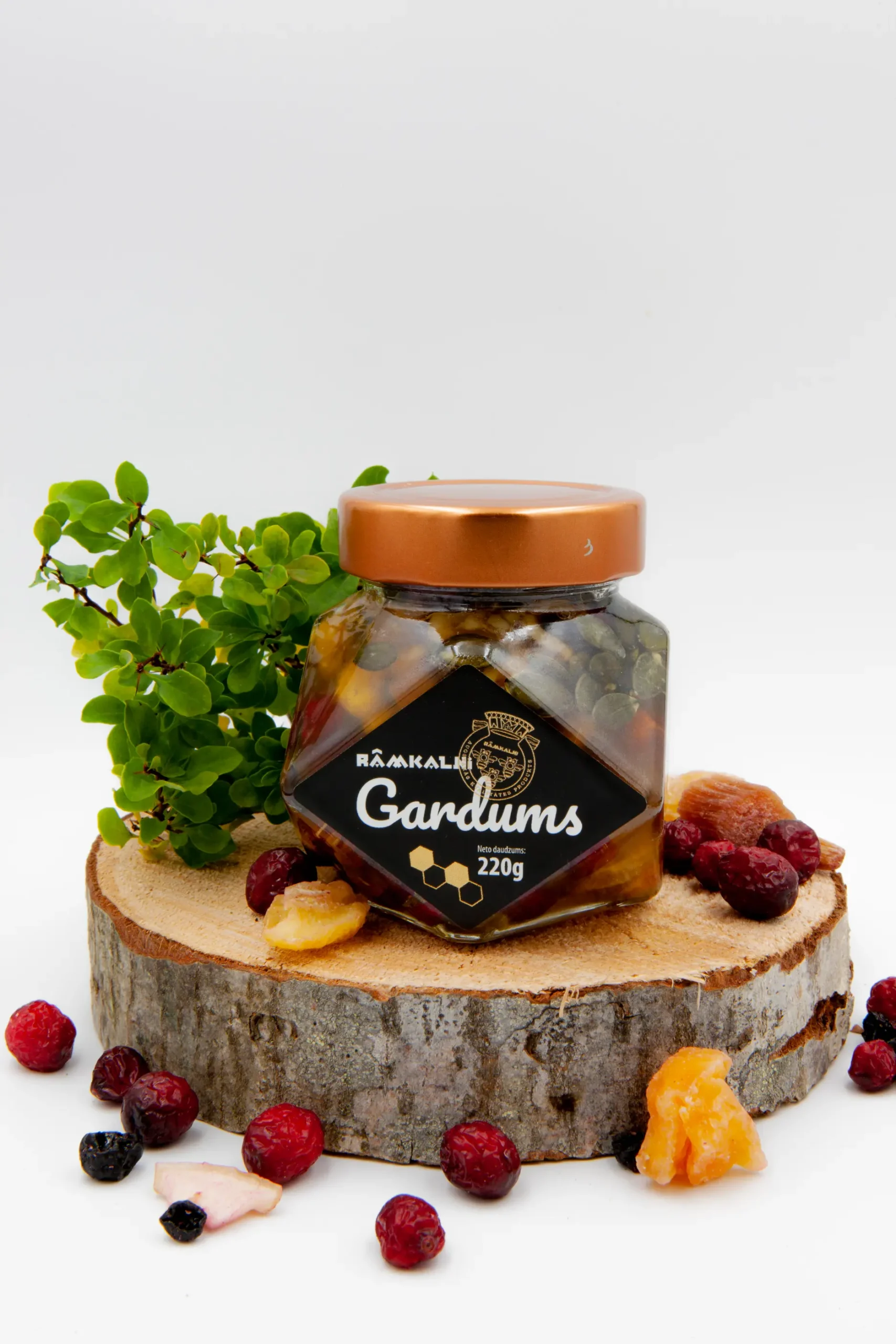• Ingredients: Honey 59%, quince candied 50% (quince, sugar), walnuts, hazelnuts, cranberry candied (cranberries 50%, sugar), pumpkin seeds, cashew nuts.