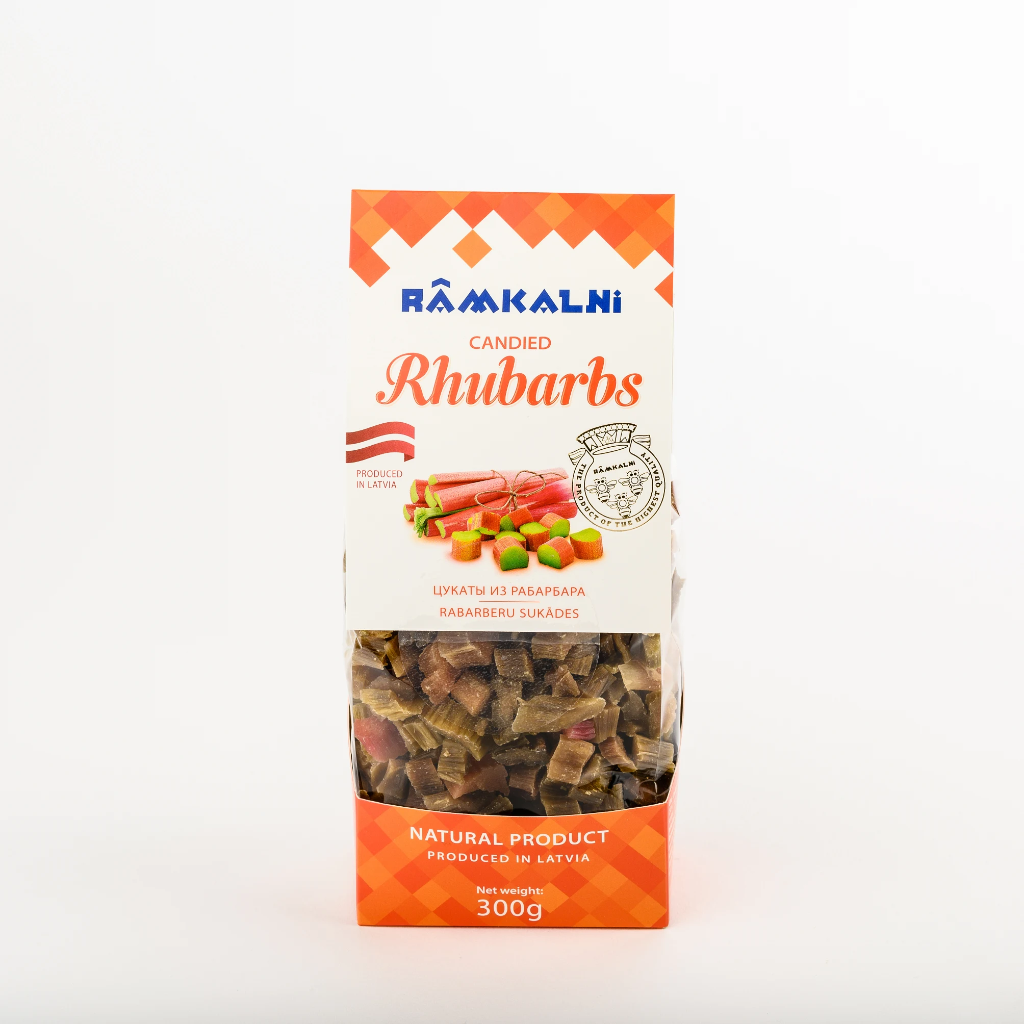 • Produkta sastāvdaļas: Rabarbers 50%, cukurs. Var saturēt labības ,kas satur lipekli, piena un dažādu riekstu daļiņas.